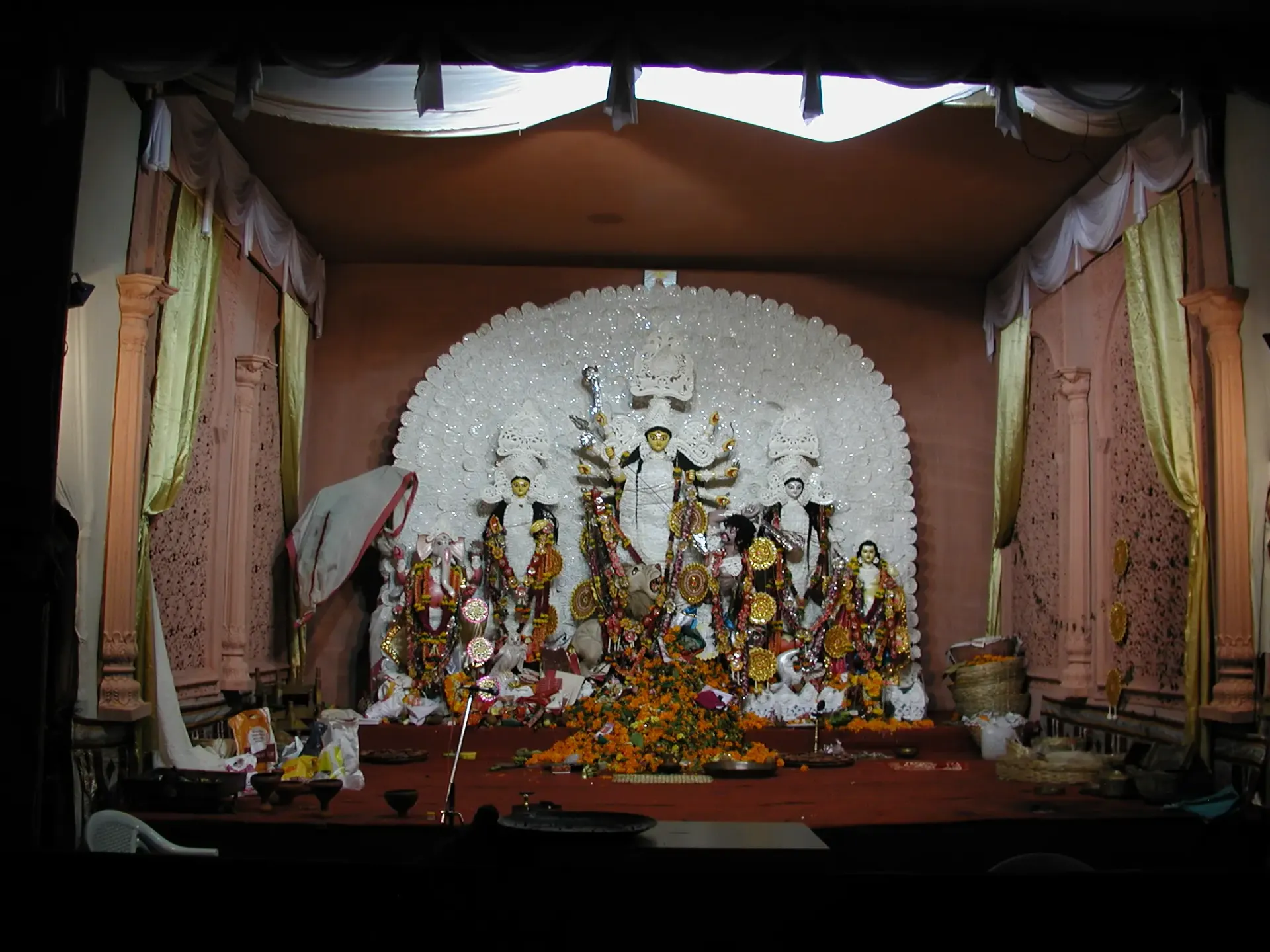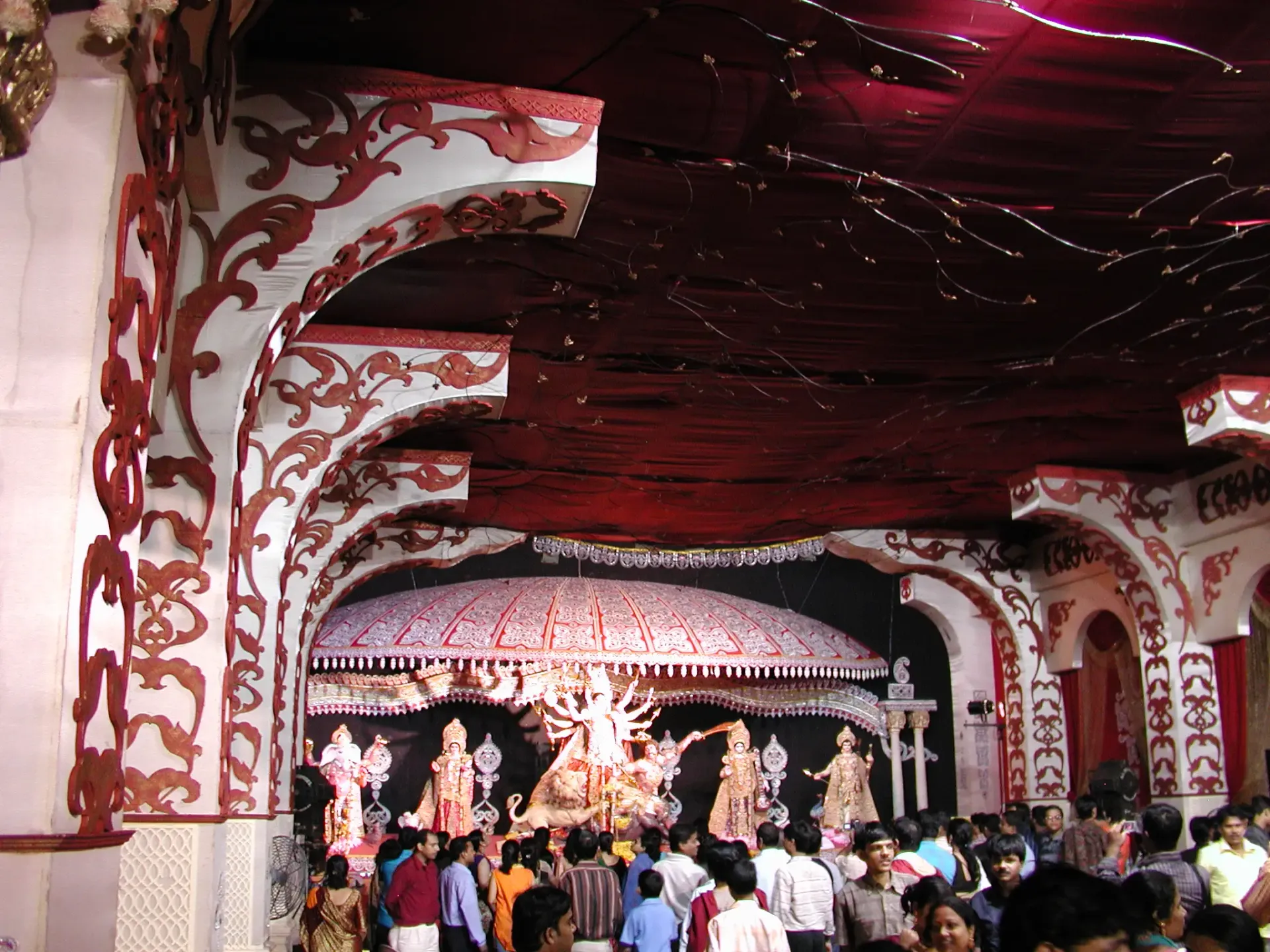 The midday puja ritual involves offering pushpanjali (floral tributes) to the goddess, followed by the distribution of prasad (holy food). The traditional prasad includes khichuri (rice and lentil dish), baigan bhaja (aubergine fry), labra (mixed vegetable dish), chutney, and payesh (rice pudding). However, the large crowds and empty stomachs required for the ritual often led to long queues for prasad.