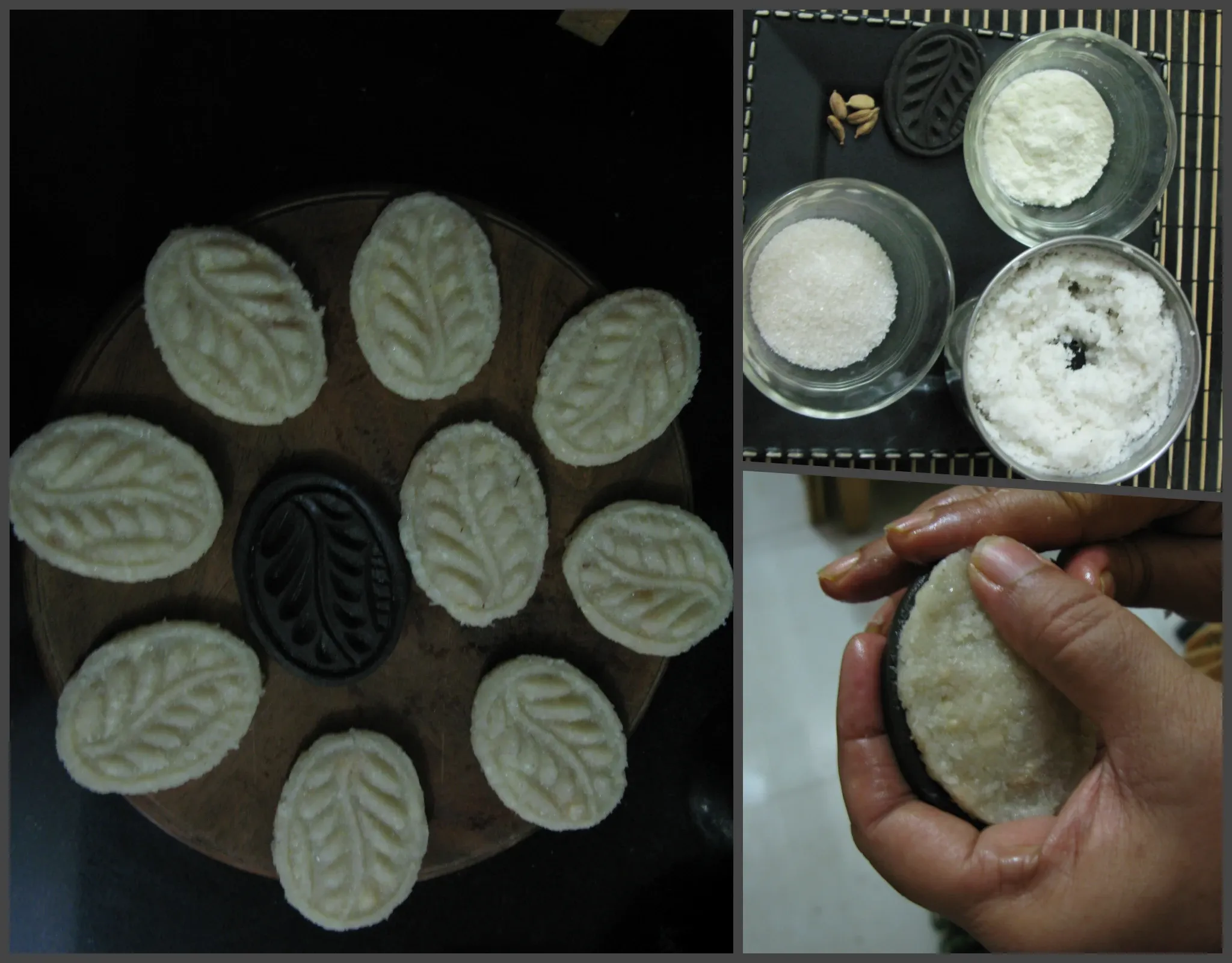 - Now cool it a little and then smear the stone mold with oil; Press sugary-coconut on the mold to decorate their upper surface occasionally with the help of water.