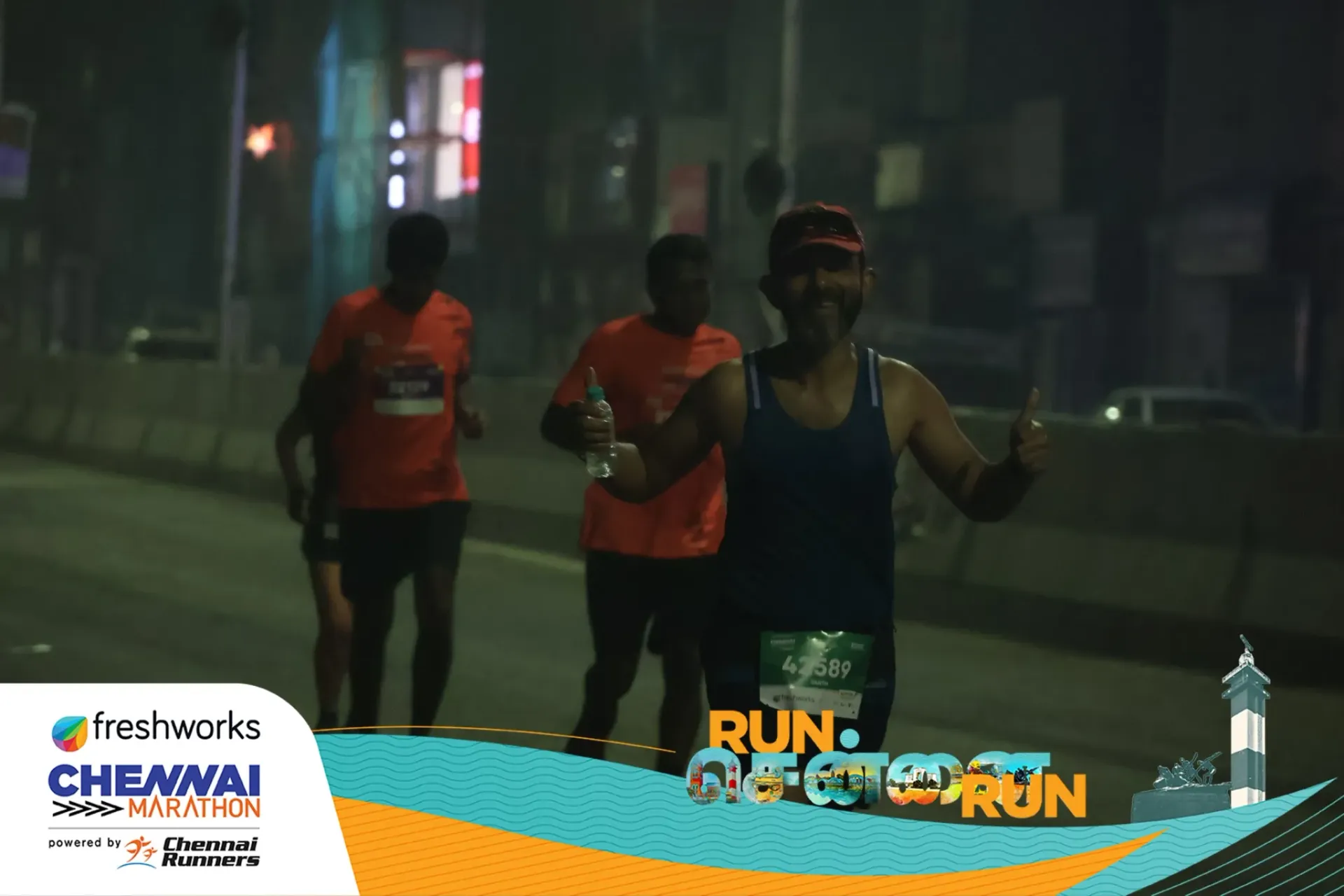 The race started at 4 AM, with the course winding through Chennai’s major roads. The terrain was flat, save for a flyover and a bridge. The event featured four categories: 10K, 21K, 32K (20-miler), and 42K. While the 21K started mid-course, the 32K and 42K runners shared the route for the most part, diverging only after the 30K mark.