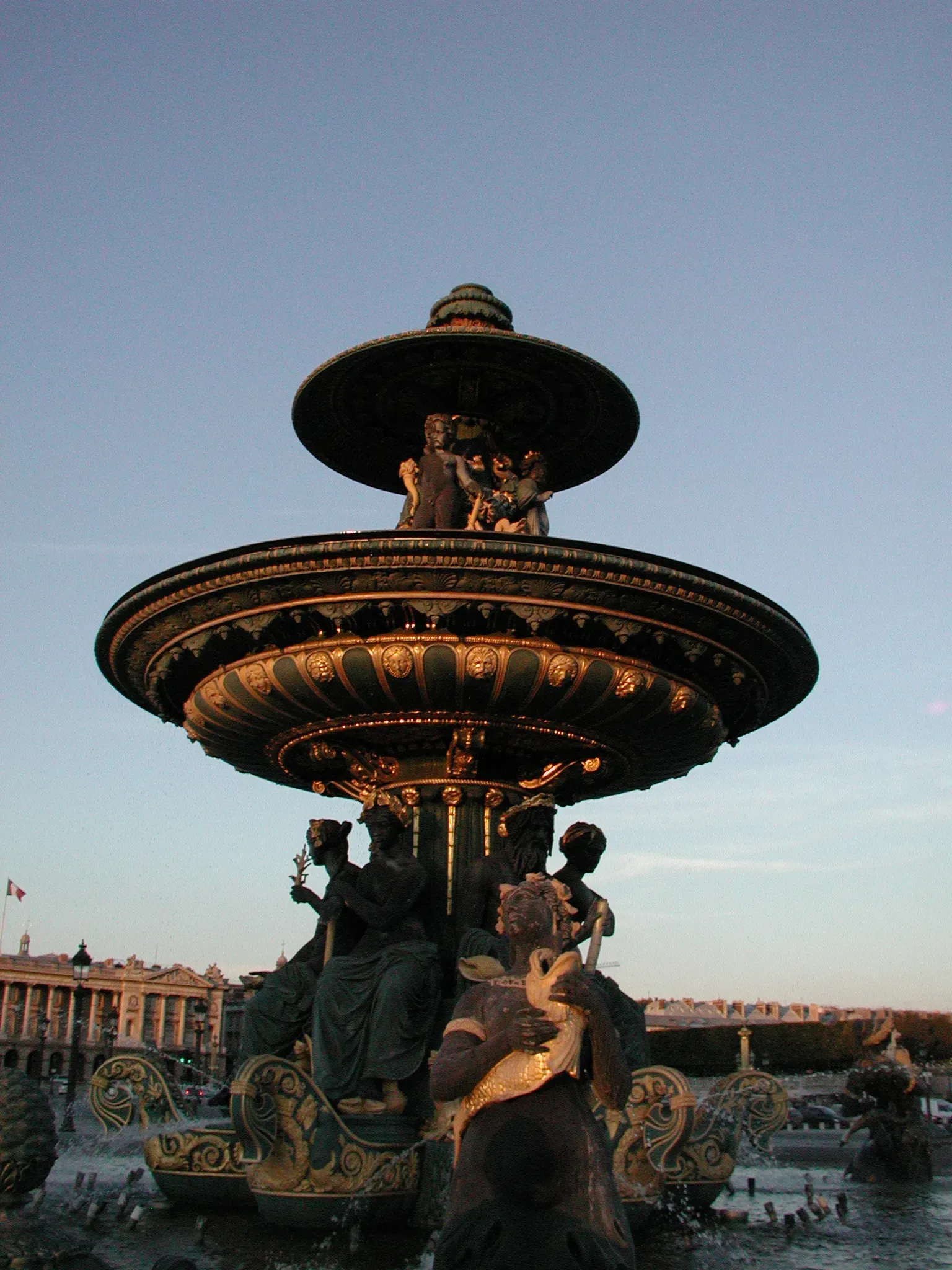 Experience Parisian charm at sunny **Place de la Concorde** with its grand fountains reminiscent of Vatican's St. Peter’s Square, surrounded by iconic landmarks like the Arc de Triomphe and Louvre...